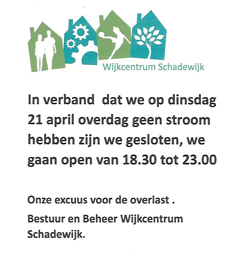 - Op 19 april is er weer een grote binnen rommelmarkt entree is [ gratis ]Locatie Wijkcentrum Schadewijk . Van 10.00-16.00.